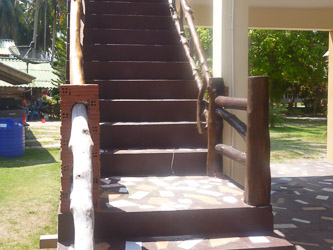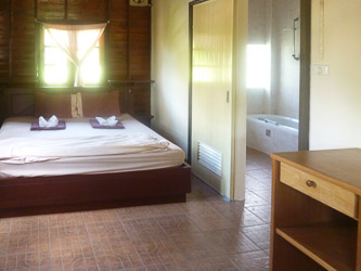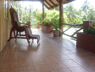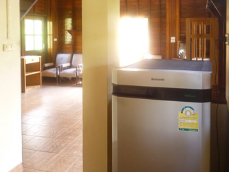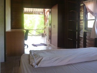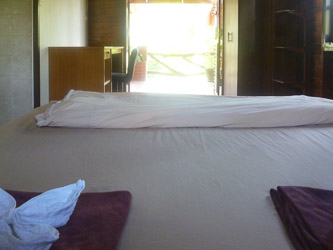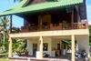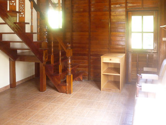 The large balcony has double doors which on one side open up into the living area with seating, TV and kitchen. The other set of doors take you straight into the air conditioned bedroom and the bathroom connects these two rooms. Upstairs you will find a large wooden loft area for your use.