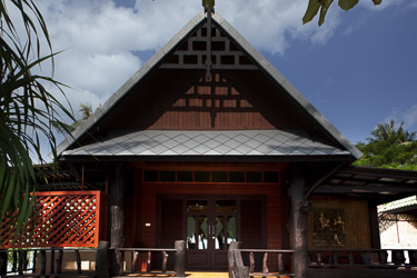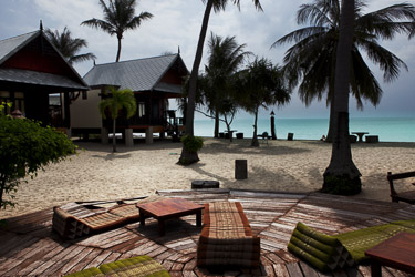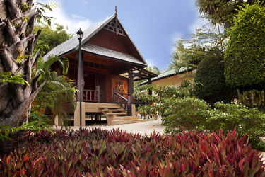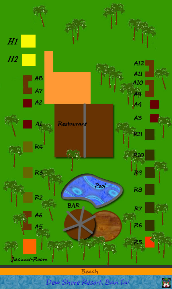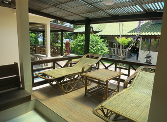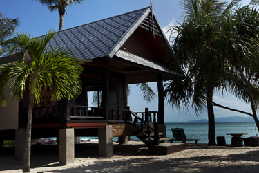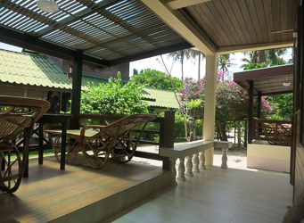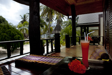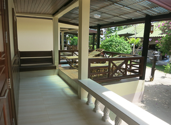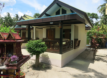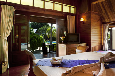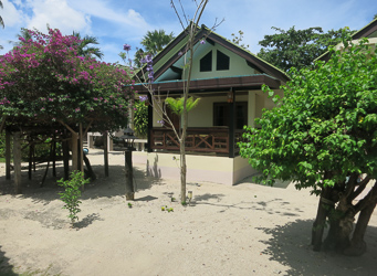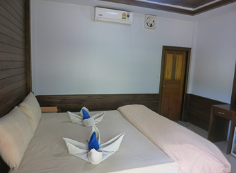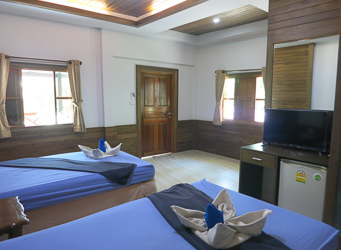 Roomy wooden bungalows include aircon, fridge, tv, wardrobe, desk and bathroom with hot water shower.