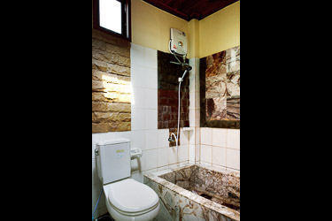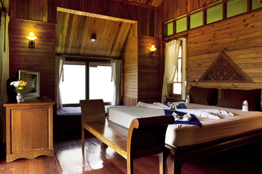 Spacious wooden bungalows with bay windows include aircon, fridge, tv, wardrobe, desk and bathroom with hot water shower and bath tub