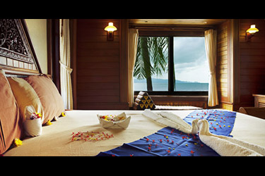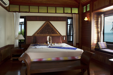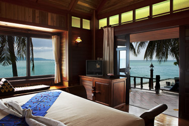Luxurious wooden bungalow includes a large balcony with jetted bathtub facing the sea, aircon, fridge, tv, wardrobe, desk, and bathroom with hot water shower and bathtub.